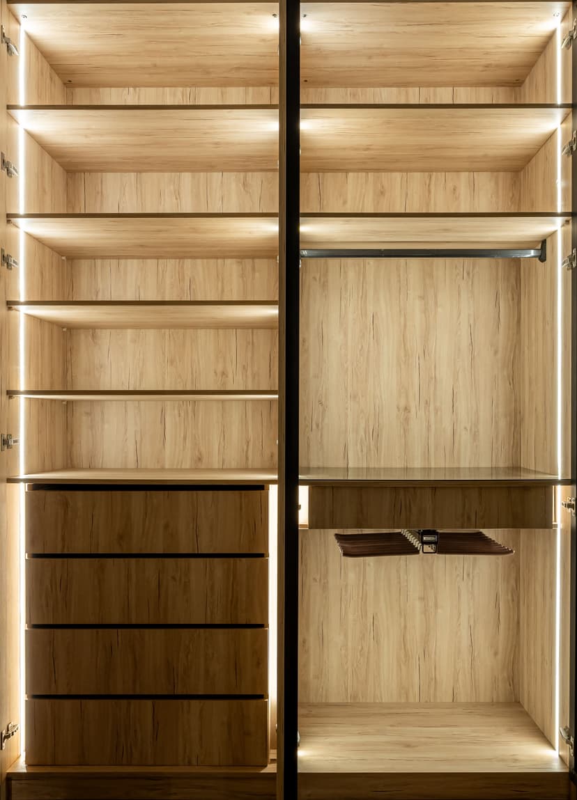 This dressing room transformation focused on creating luxurious, highly-organized personal space. We designed and installed bespoke storage solutions, including specialized shelving and drawers, alongside elegant lighting and fulllength mirrors, resulting in a stylish and practical sanctuary perfect for getting ready
